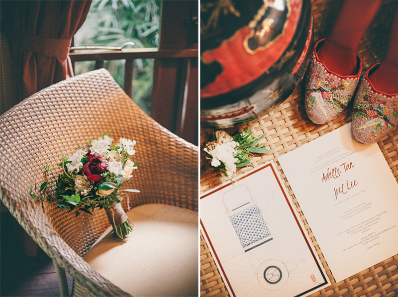 Left: Adelle’s bouquet with a single rustic red peony. Right: Adelle’s grandmother’s “Bakul Siah” was used to store red packets from loved ones. Custom-made “Kasut Manek”, gifted from Joel’s mum to her new daughter-in-law. The wedding invitation, featuring a hand-drawn architectural illustration of Joel’s late grandmother’s teapot.