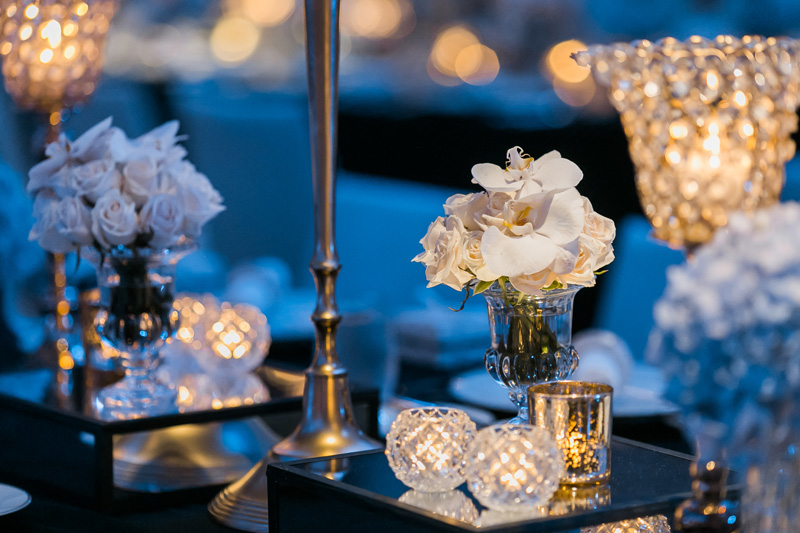 “Wishing Tree is a decor company that thinks ahead of their customers and always gives their customers more choices and advice since they have countless experience in decorating the events and weddings. When I told Lily I wanted blue and white for the wedding, she reminded me these two colours may not be popular in the Chinese culture especially to elderly, so she used ivory roses instead of using all white flowers. We loved the black table linens throughout the ballroom, but to ensure the main table would stand out from the rest, she covered ours with a shimmer tablecloth.